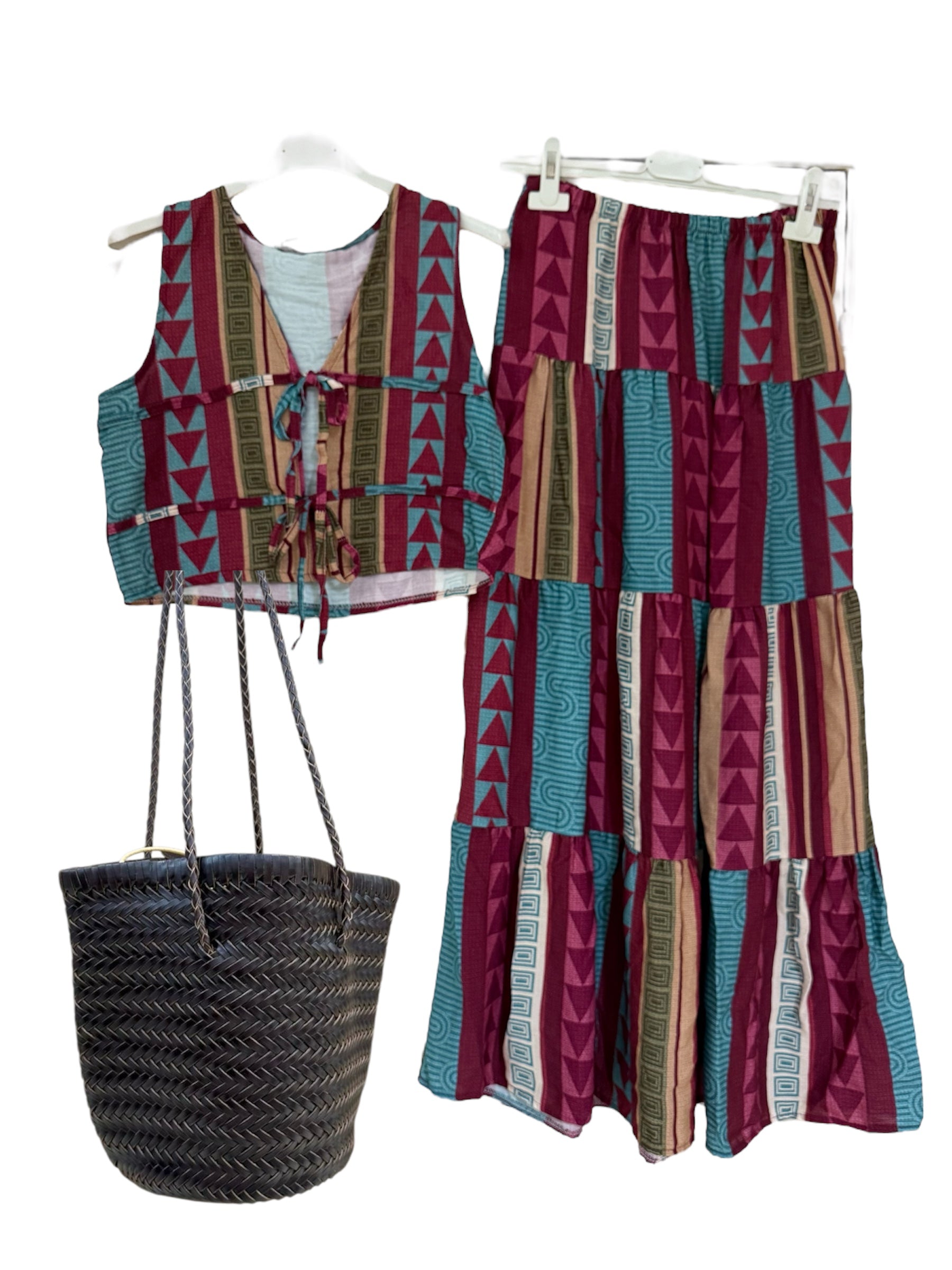 Conjunto de falda y chaleco . Talla única S/M. Falda con vuelo y largo midi .Goma en la cintura . Tejido fluido