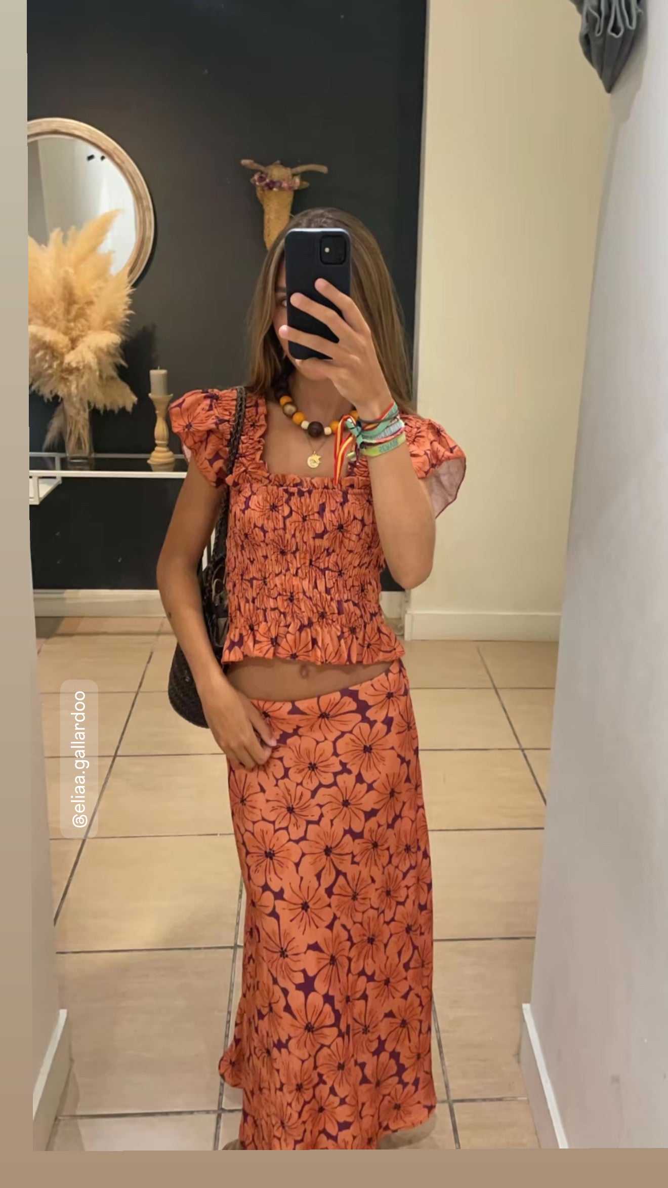 Conjunto de top y falda a juego . Top fruncido y falda con goma en la cintura. Largo midiTalla única (S/M)