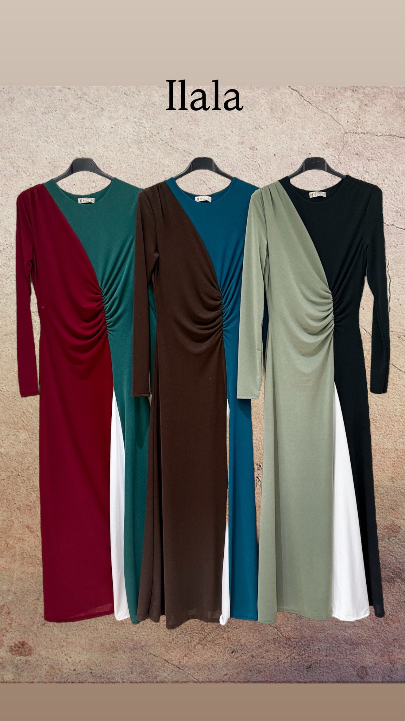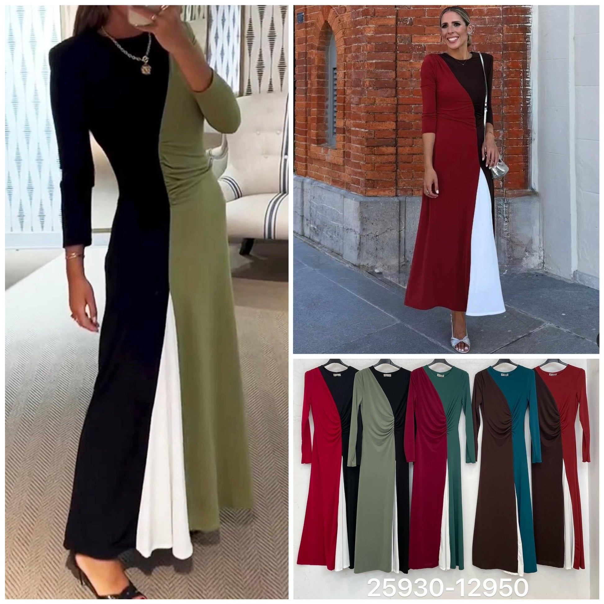 Vestido de punto de seda elástico y con falda en tres colores. Manga larga . Largo midi