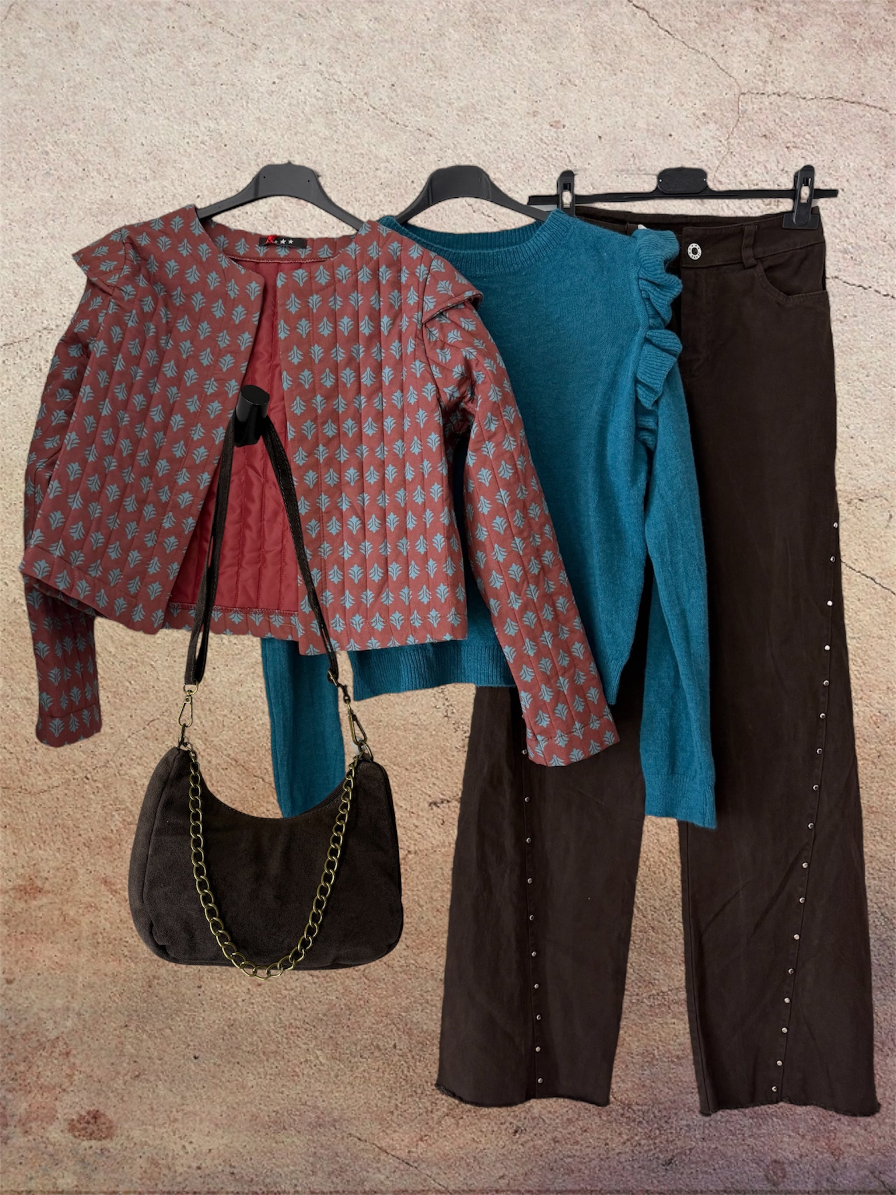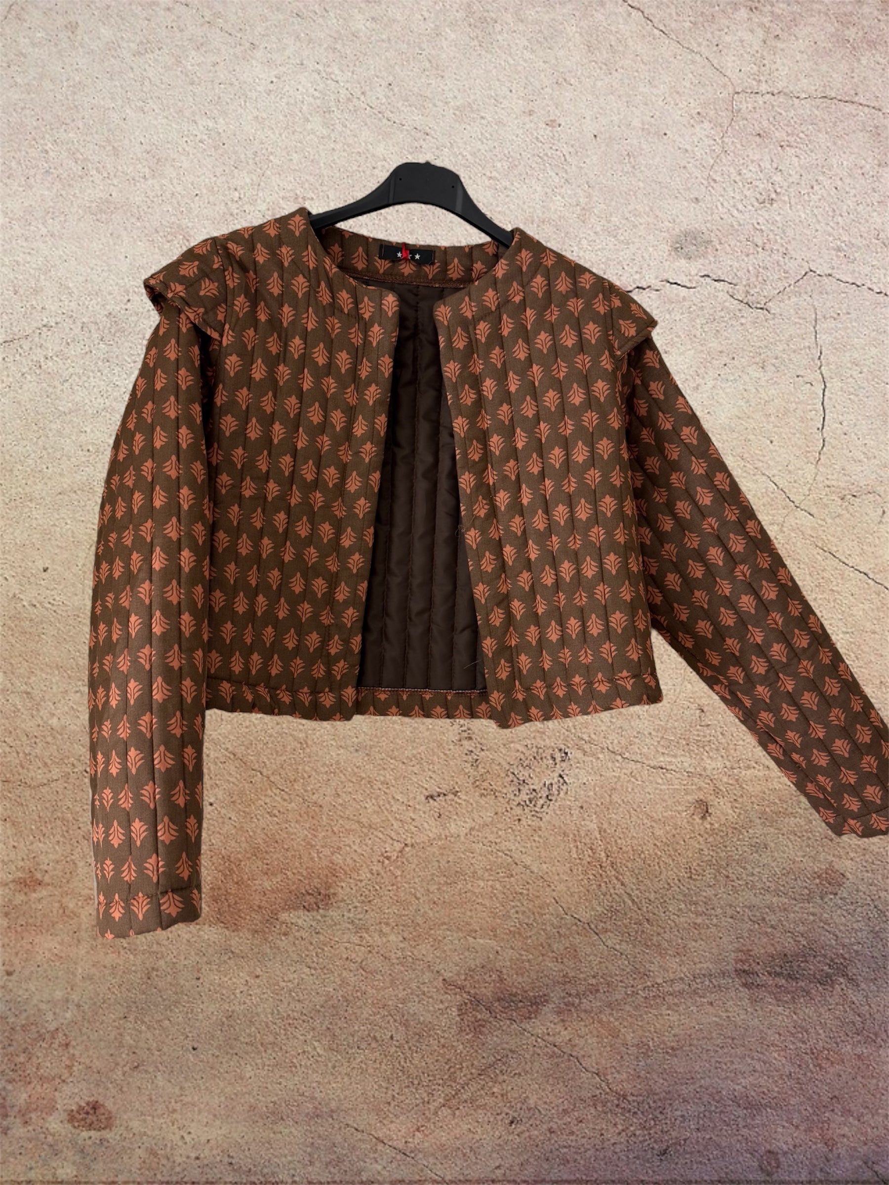 Casaco acolchoado com gola redonda e protetor de ombros. Comprimento até à cintura. Tamanho único, veste do XS ao S.