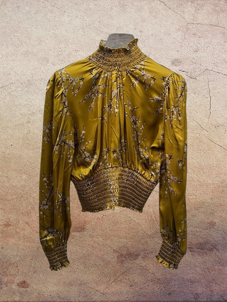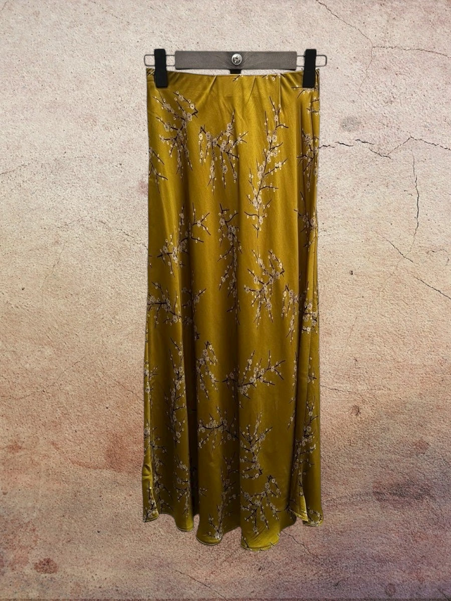Saia de cetim estampada. Comprimento midi com cintura elástica.