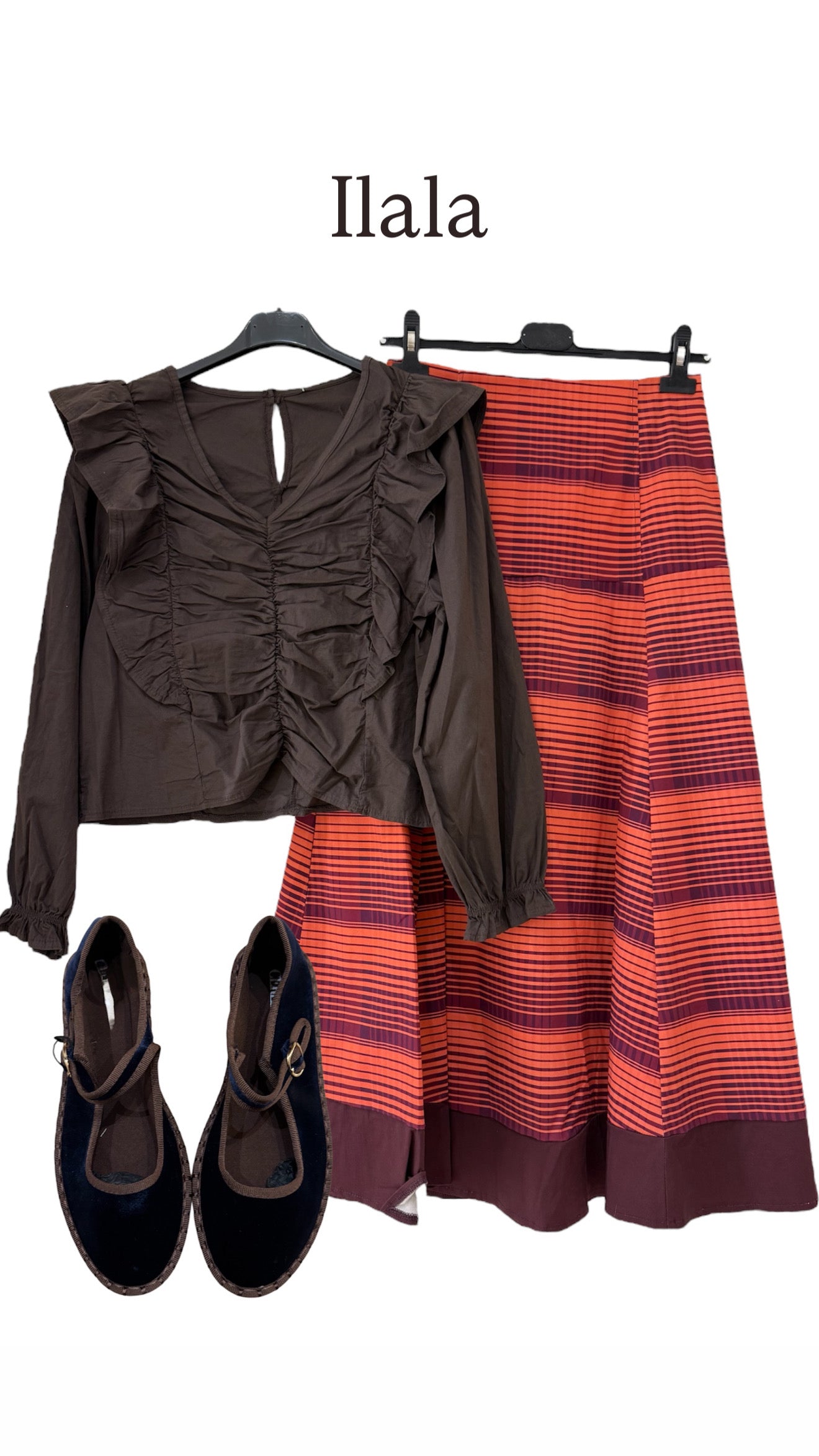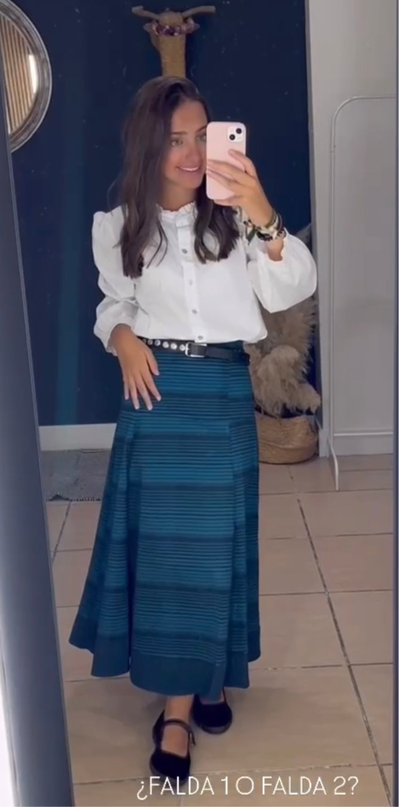Saia evasé com elástico na cintura. Comprimento midi. Tamanho XS/S. Com fecho lateral.